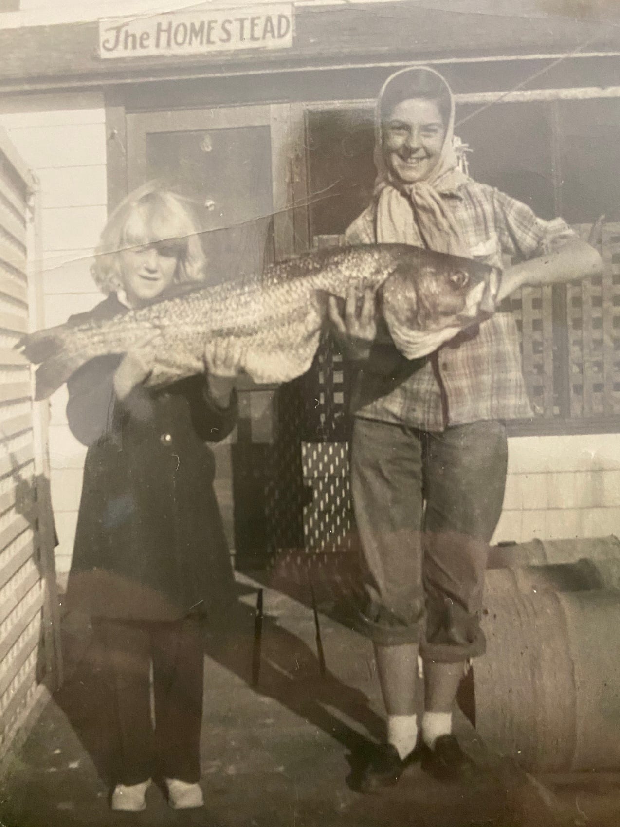 Apparently as she grew up, Pop Pop sometimes took her fishing, as evidenced by this photo. That’s my Mom on the right, apparently having her hand bitten off by a big fish.