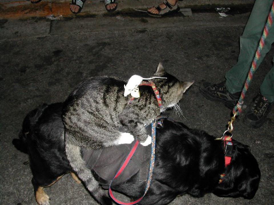 I was in Key West once and I saw a dog walking with a cat on its back. And the cat had a mouse on its back. All three just walking around.