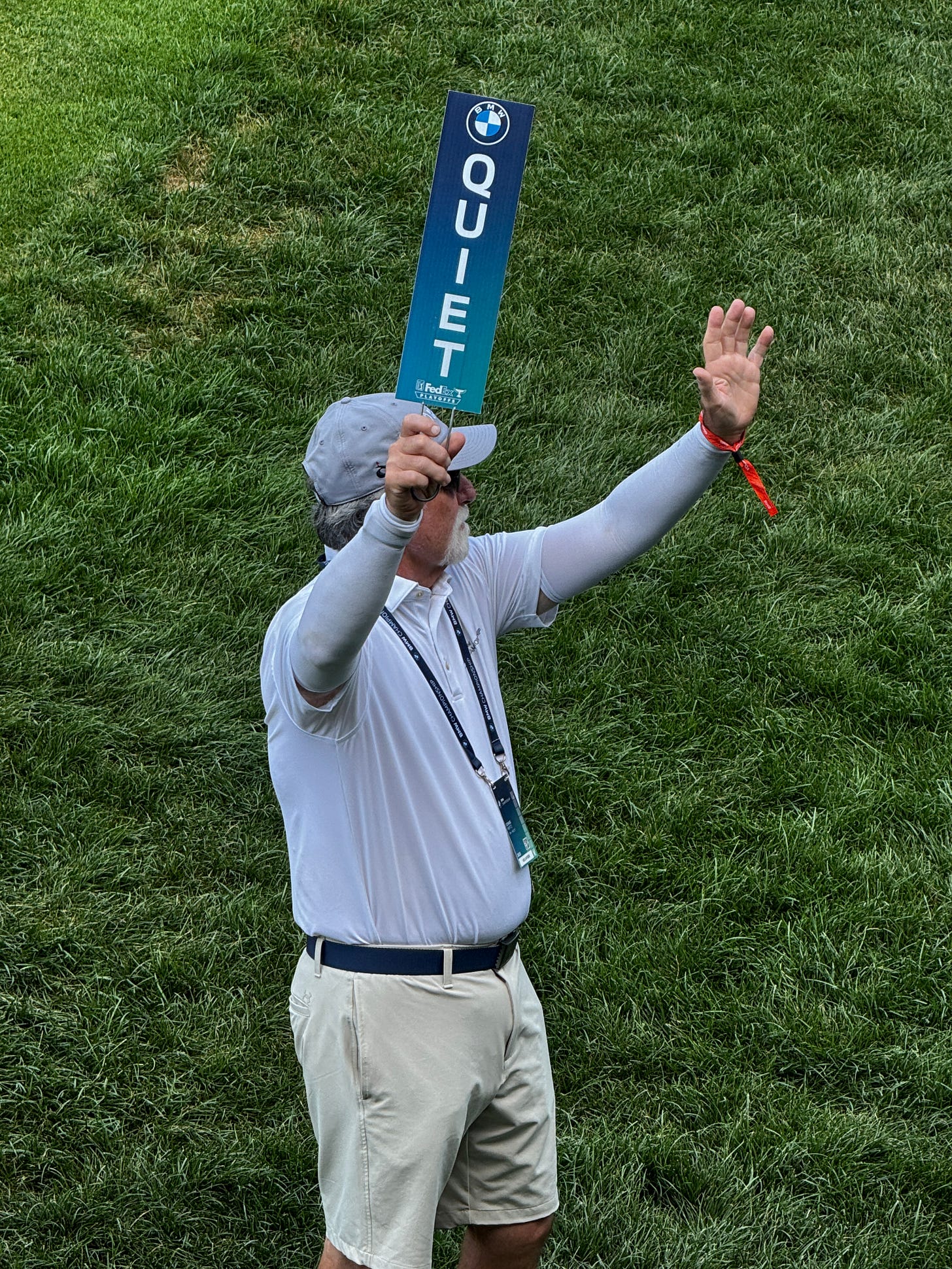 In golf, just as the pro is about to take his swing, volunteers around the course hold up these signs. Everybody stops walking and talking, and it’s actually pretty surreal to be in a large crowd that is almost silent.
